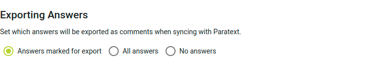 Wenn Du es vorziehst, alle Antworten nach Paratext zu exportieren, ohne sie einzeln für den Export zu markieren, gehe zu den Projekteinstellungen und suche den Abschnitt Antworten exportieren. Die Standardoption besteht darin, nur Für den Export markierte Antworten zu exportieren, aber diese Einstellung kann auf Alle Antworten oder Keine Antworten geändert werden.