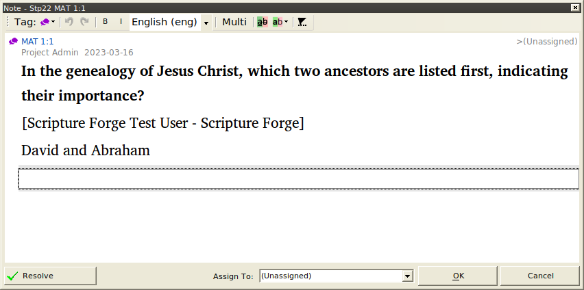 Notizen, die aus Antworten durch die Überprüfung mit der Zielgruppe generiert wurden, werden ein eigenes Notizsymbol haben, das sich von anderen Notizen in Deinem Paratext-Projekt unterscheidet. Du kannst das Symbol ändern, indem Du das Notizsymbol bearbeitest. Details dazu findest Du im Paratext-Hilfeartikel über benutzerdefinierte Notizensymbole. Auch kannst Du die Notizen nach Notizensymbol filtern, sodass Du nur die Antworten auf die Überprüfung durch die Zielgruppe anzeigen oder sie ganz ausblenden kannst.