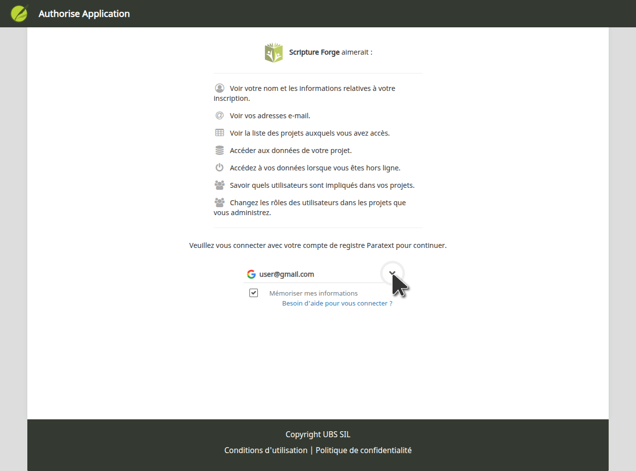 Ensuite, autorisez Scripture Forge à se connecter à votre compte Paratext. Lorsque vous y êtes invité, tapez l'adresse e-mail associée à votre compte de registre Paratext puis cliquez sur la flèche de connexion (ou appuyez sur la touche Entrée)