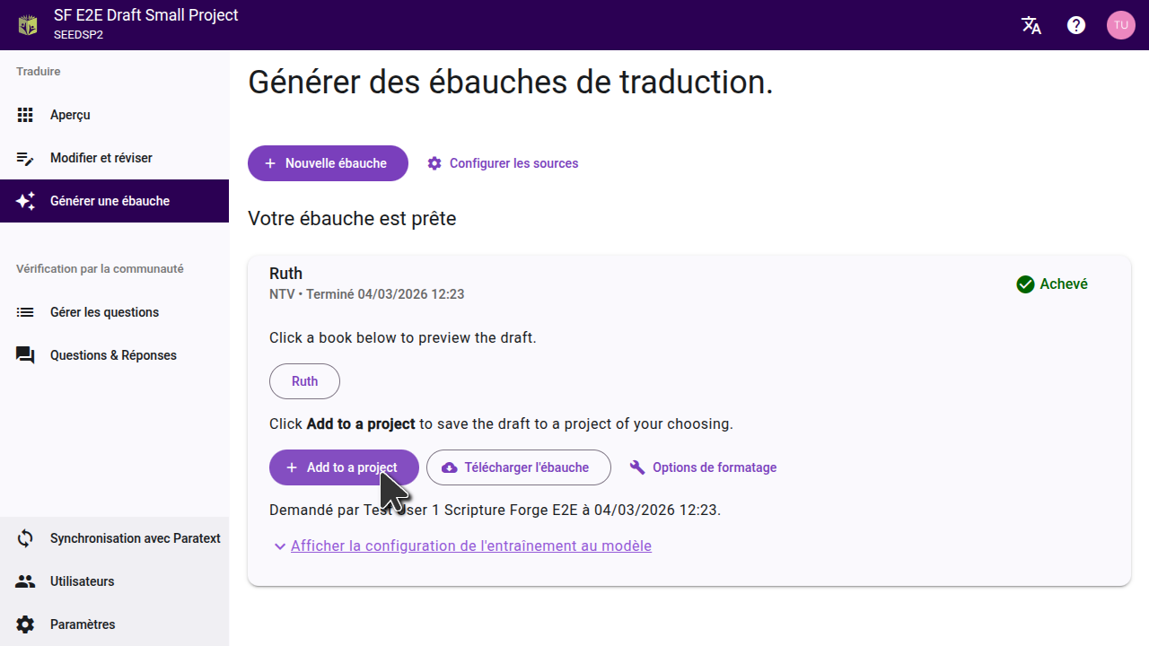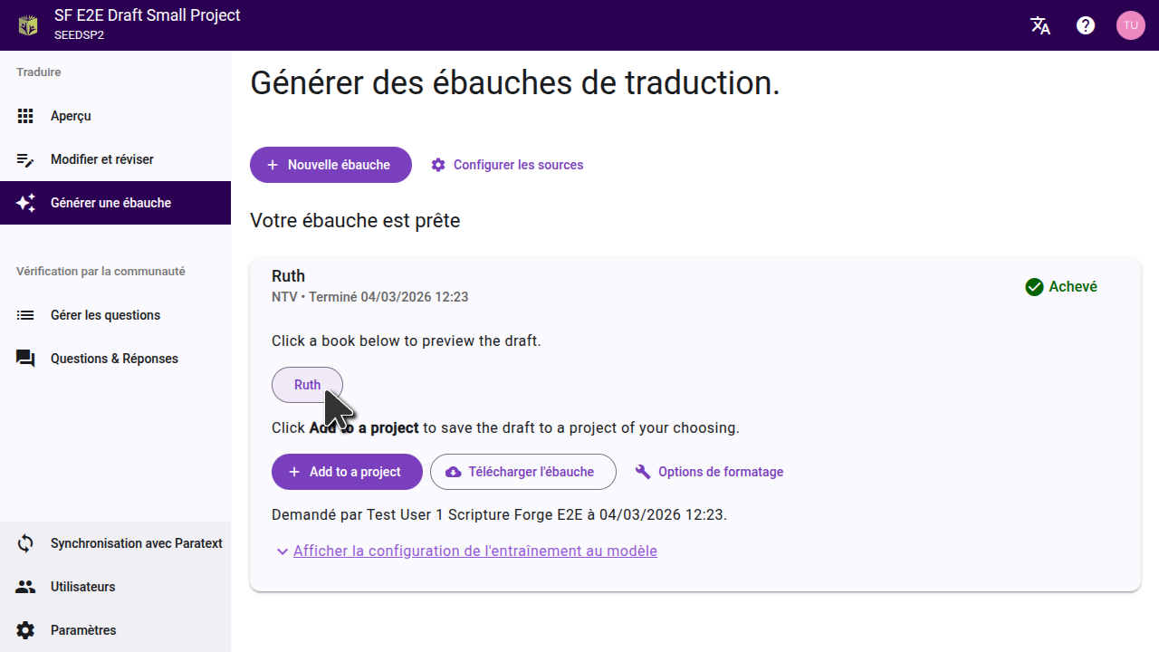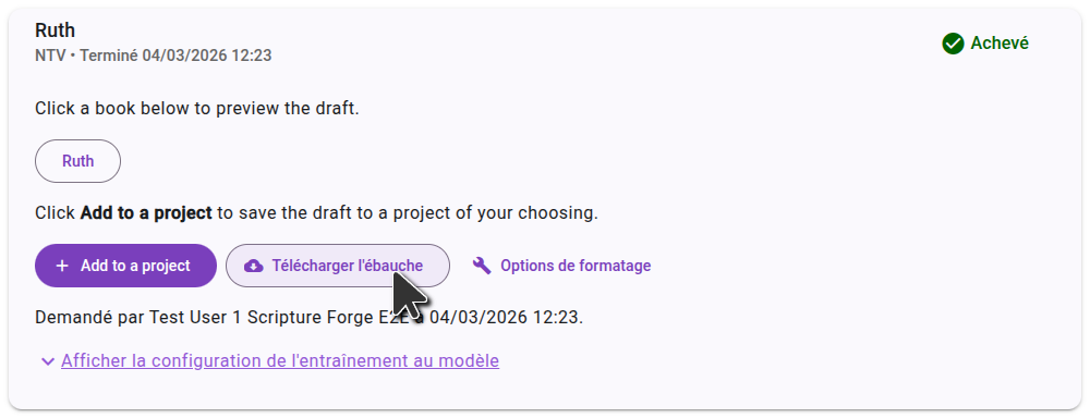 Si vous préférez ne pas importer l'ébauche directement dans votre projet, vous pouvez également télécharger l'ébauche sous forme de fichiers USFM. Dans la page "Générer l'ébauche ", cliquez sur "Télécharger l'ébauche ", et extrayez les fichiers sur votre ordinateur. Vous pouvez ensuite importer ces fichiers dans un projet dans Paratext.