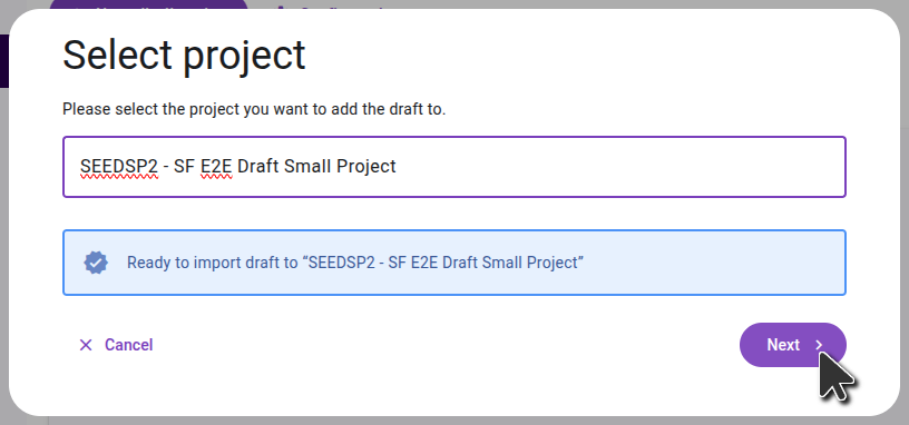 Dans la boîte de dialogue qui s'ouvre, sélectionnez le projet dans lequel vous voulez importer l'ébauche. Si le projet n'a pas encore été connecté à Scripture Forge, vous devrez d'abord le connecter. Important: Importer l'ébauche remplacera tout contenu existant dans le projet pour ce livre.