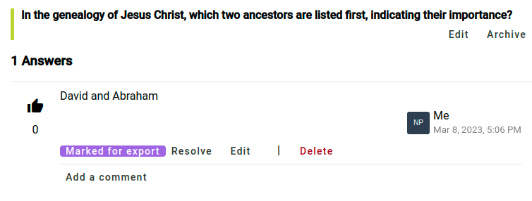 Untuk melihat jawaban dari para masyarakat pemeriksa, klik salah satu kitab di bagian Pemeriksaan Masyarakat pada bilah sisi navigasi. Kemudian klik pada sebuah pertanyaan untuk melihat jawaban yang telah diberikan. Jika Anda ingin jawaban diekspor ke Paratext, klik Tandai untuk diekspor pada jawaban tersebut. Jika Anda tidak ingin melakukan apa pun lebih lanjut dengan jawabannya, klik Selesaikan. Hal ini tidak menghapus jawaban, tetapi menandainya sebagai tidak memerlukan tindakan lebih lanjut.