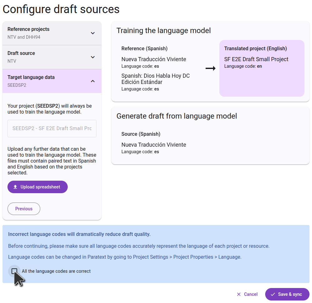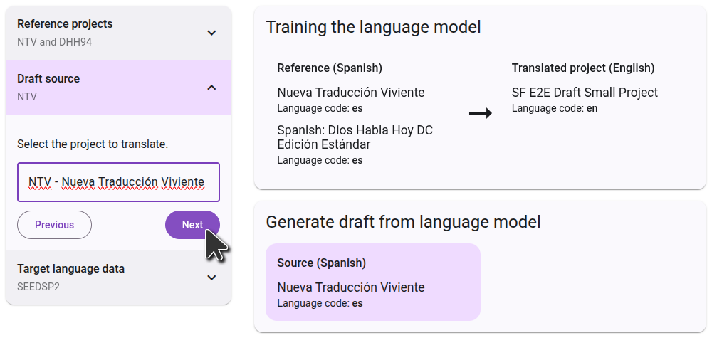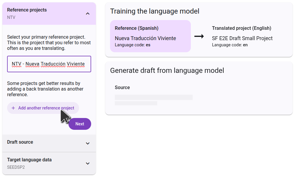On the right side, you will see a diagram of how the projects you selected will be used to generate the draft. In the first step, the language model will learn by comparing the reference projects to the translated project. In the second step, it will use that knowledge to translate the source project.
