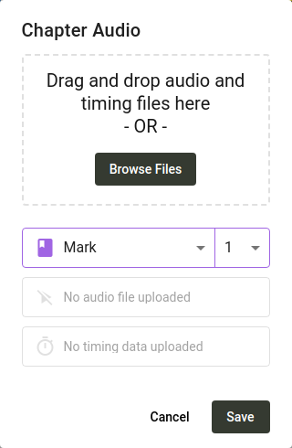 Scripture Forge can play an audio recording of each passage for community checkers. To do this, you will need to upload an audio file and a timing file for each chapter. Timing files allow Scripture Forge to highlight each verse as it is being spoken.